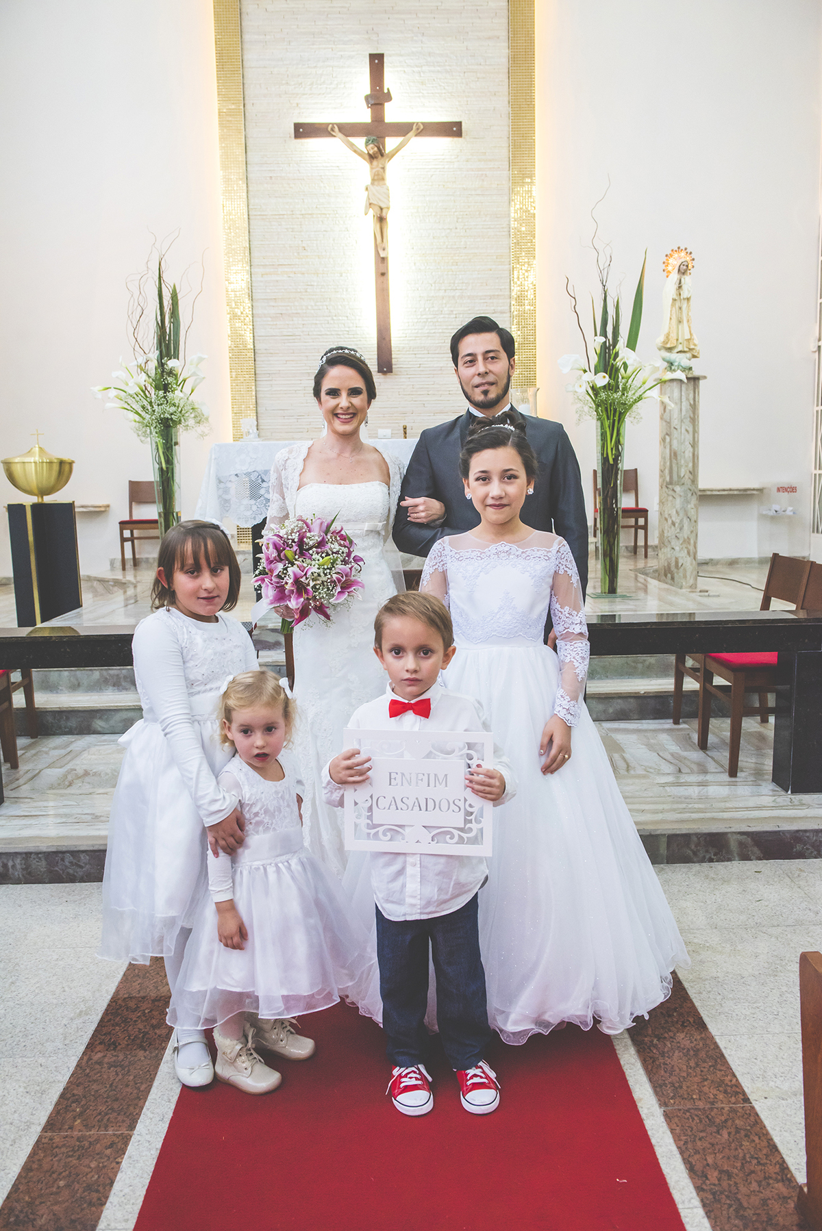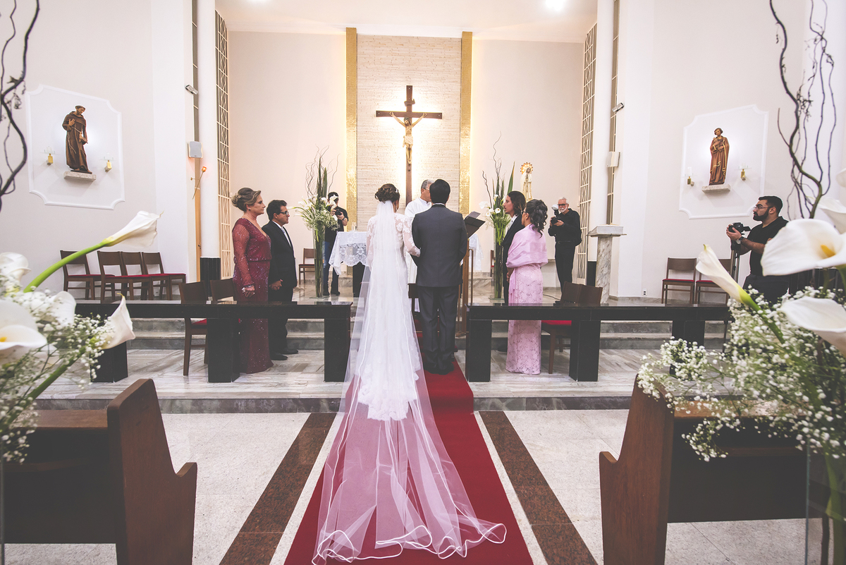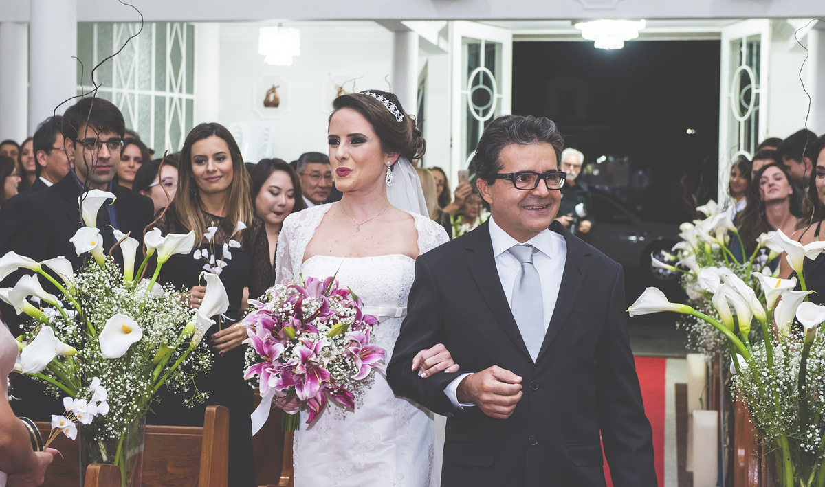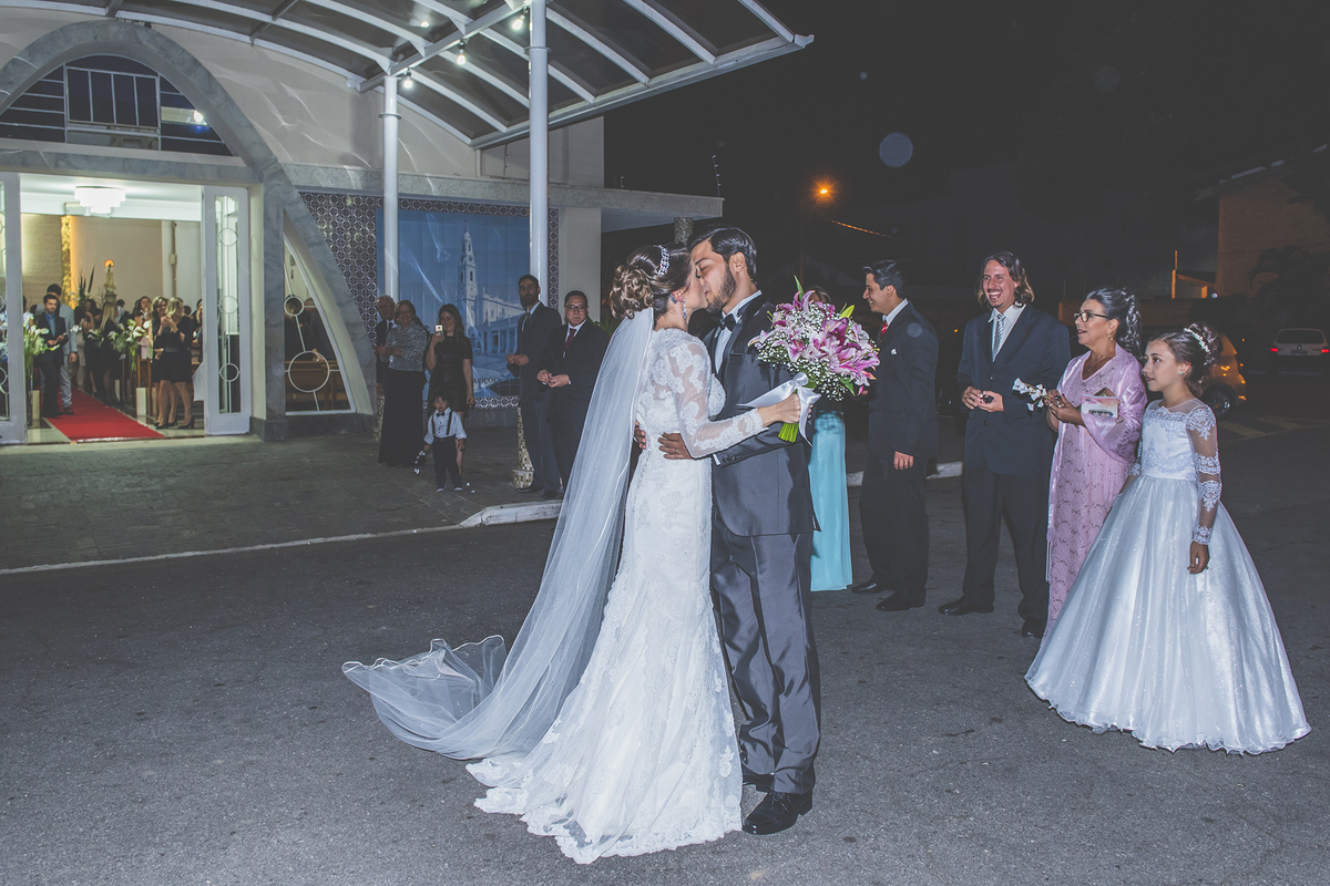 Noiva linda sendo fotografada chegando na igreja de Fátima