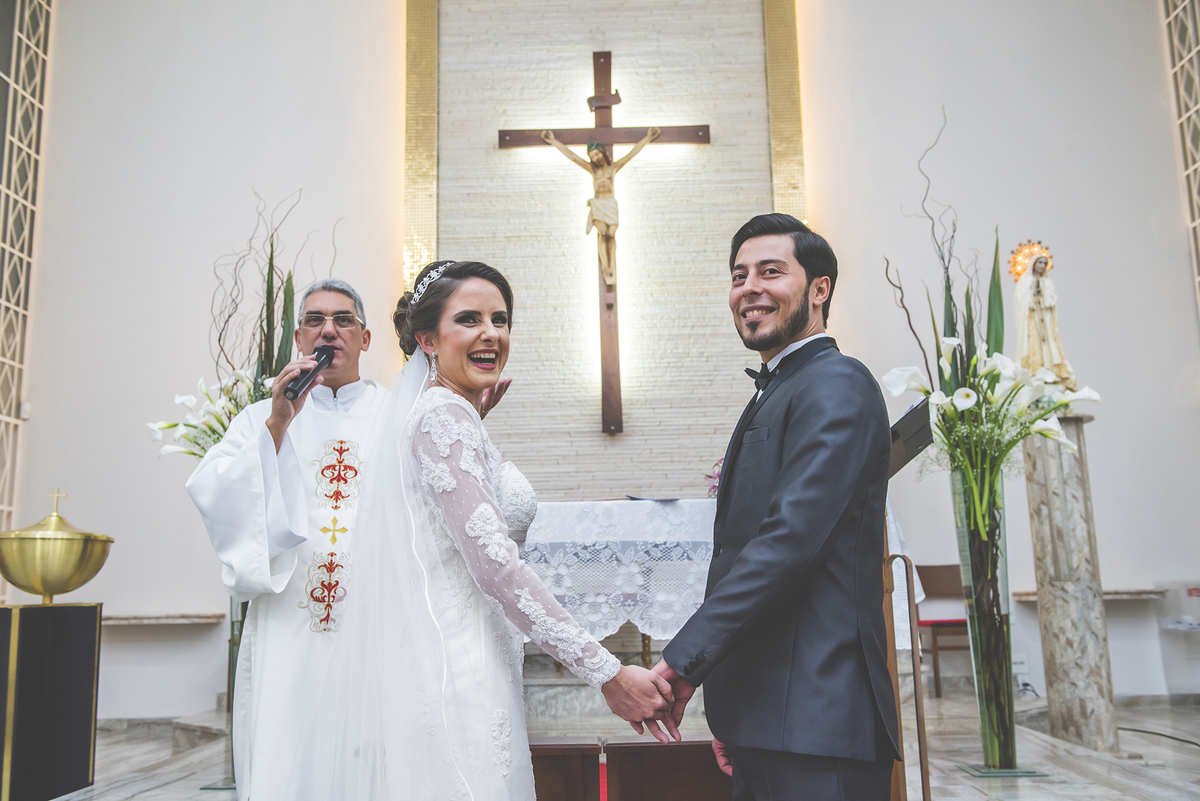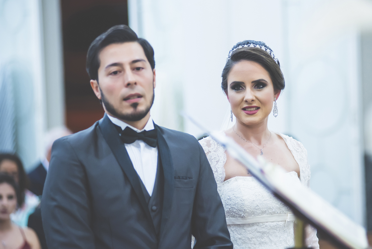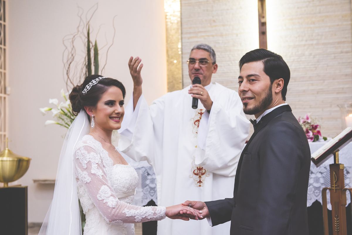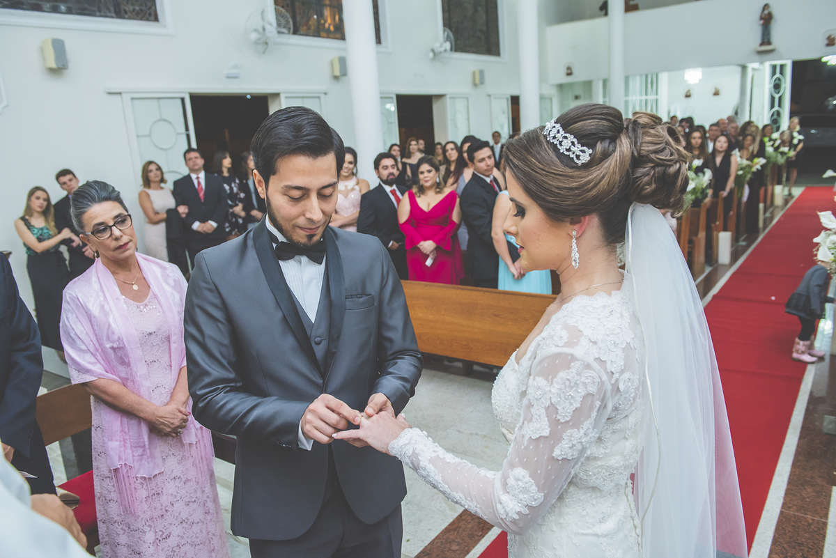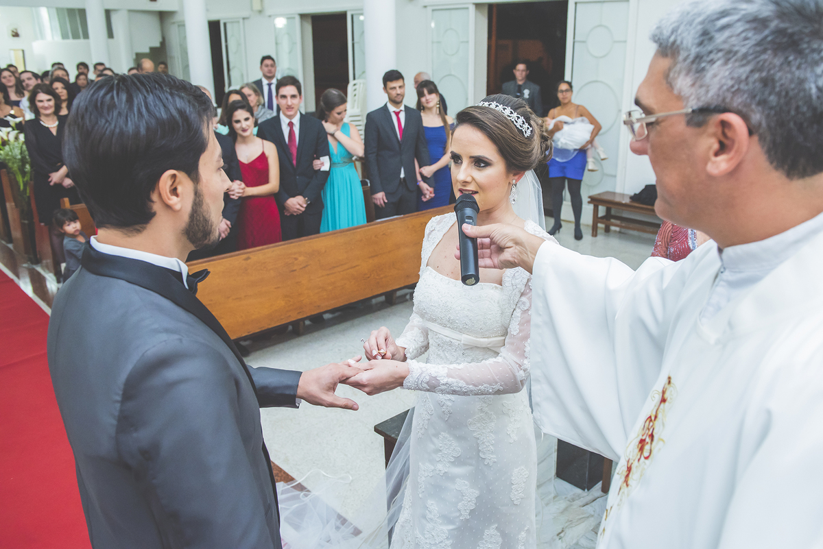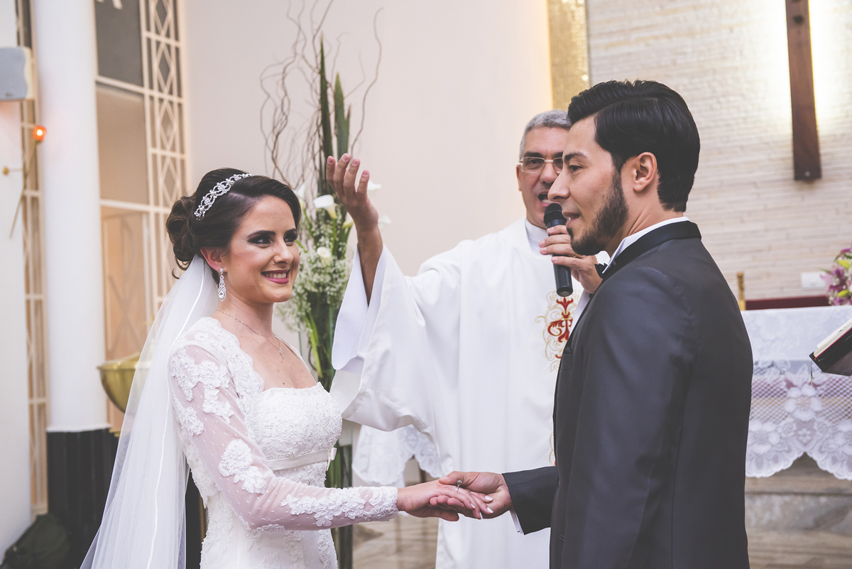 Um close fotográfico da reação dos noivos com a entrada da aliança