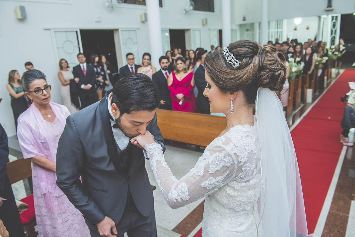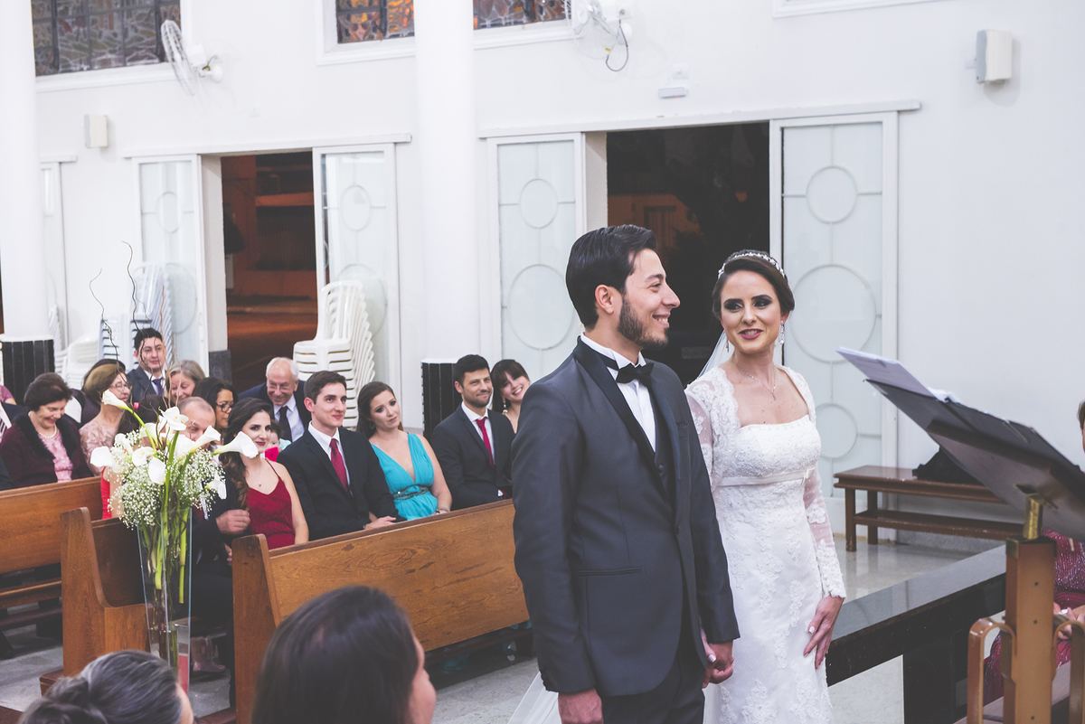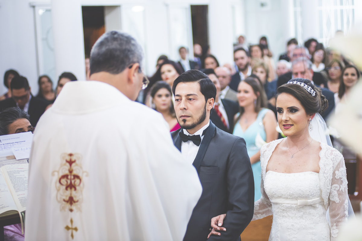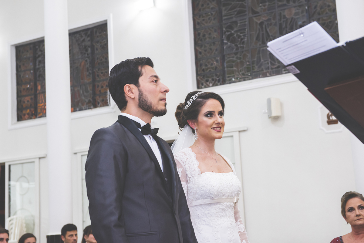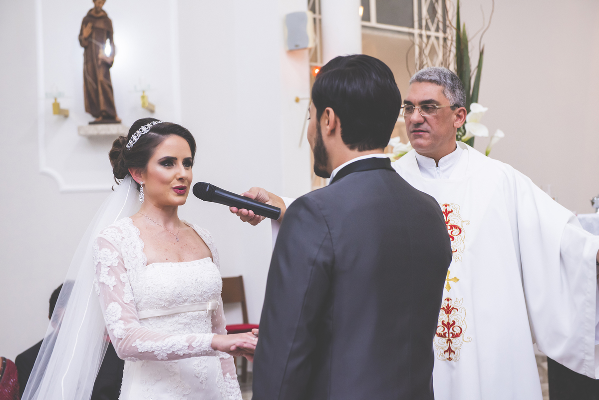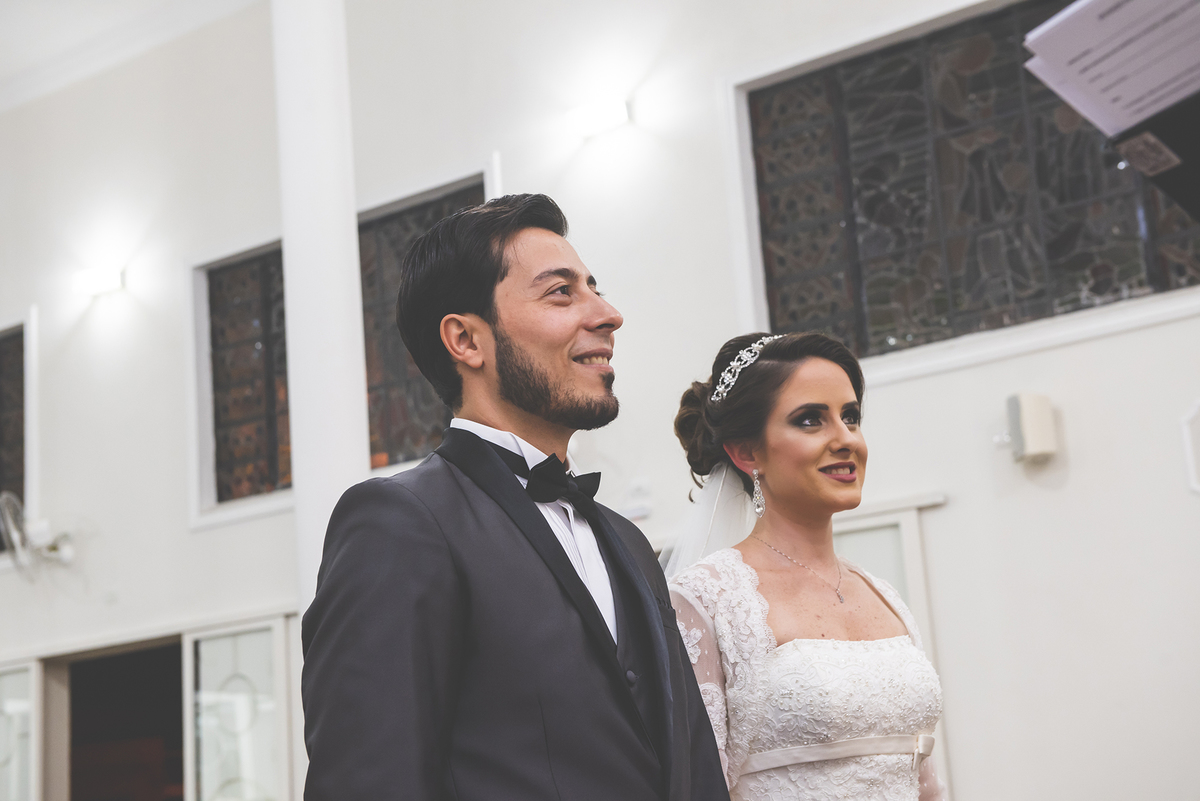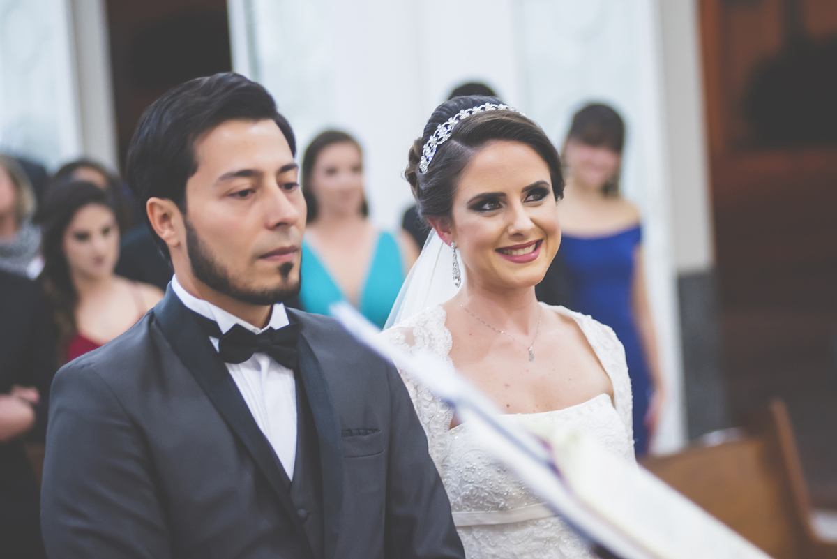 Um close fotográfico da reação dos noivos com a entrada da aliança