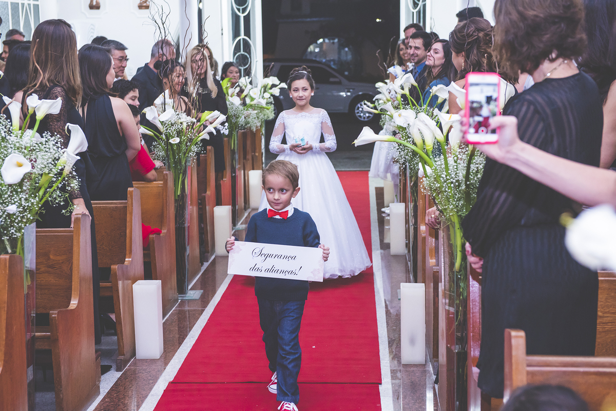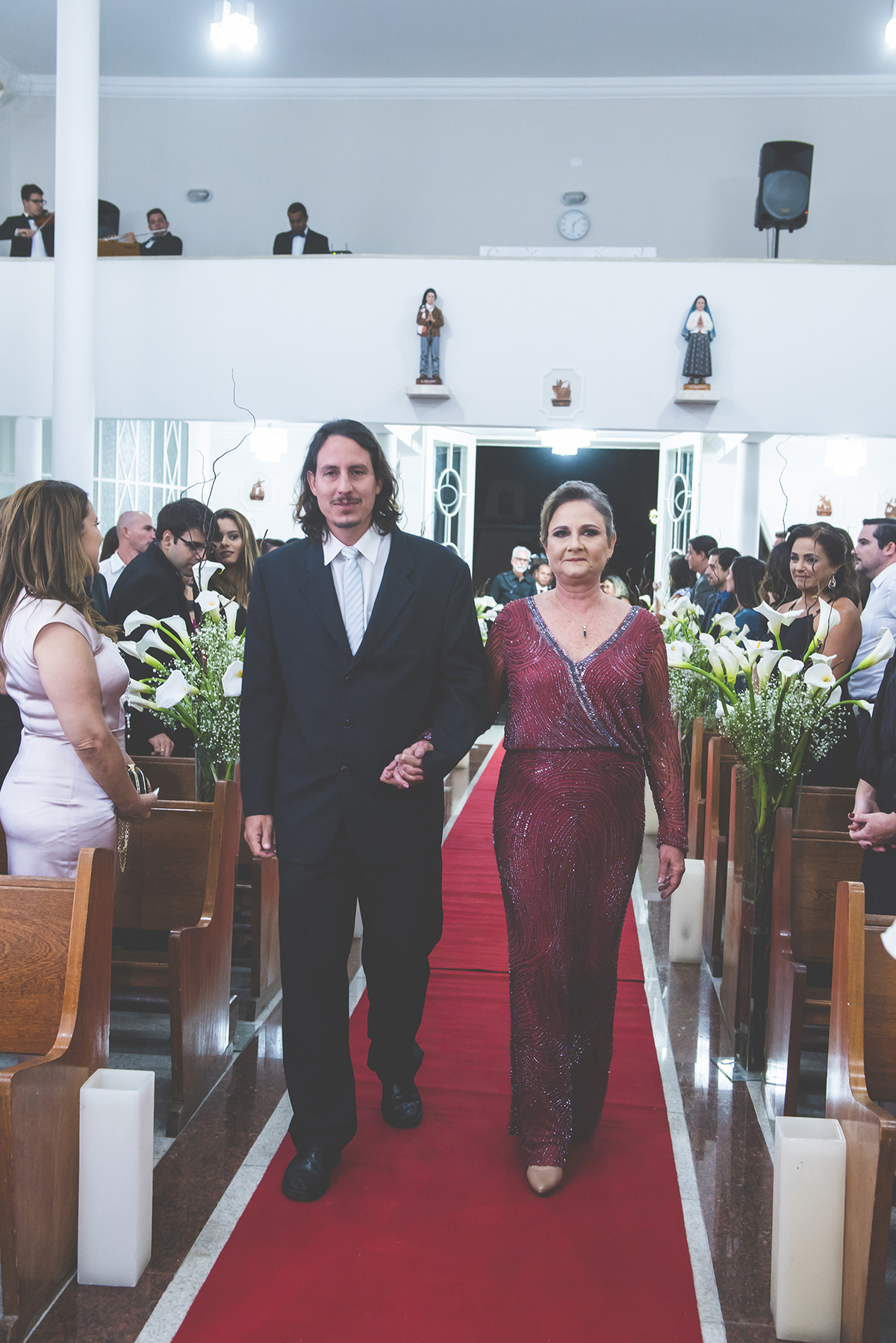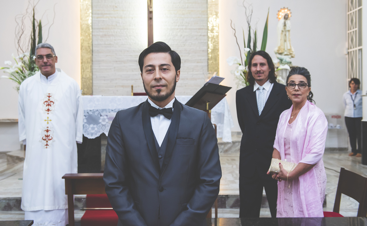 Foto em plano médio do noivo entrando com a mãe