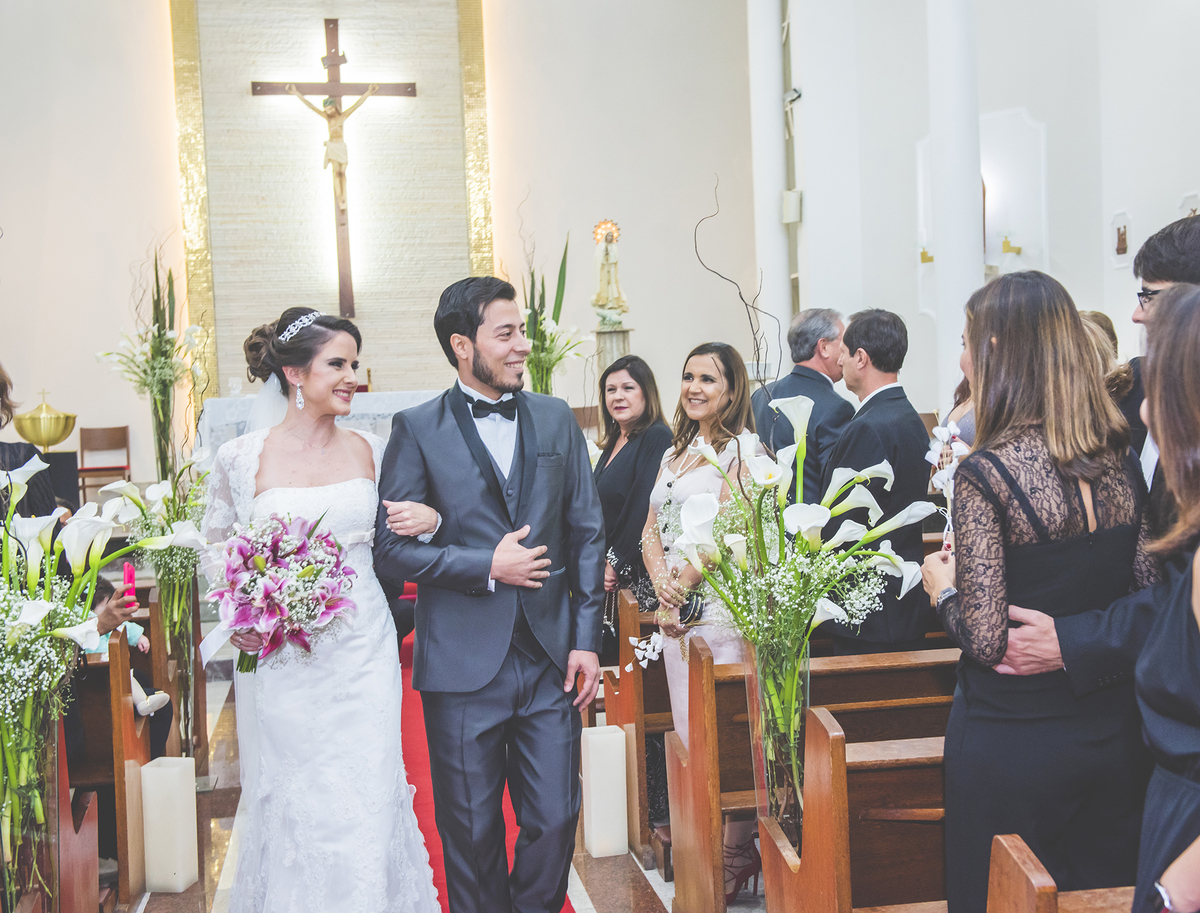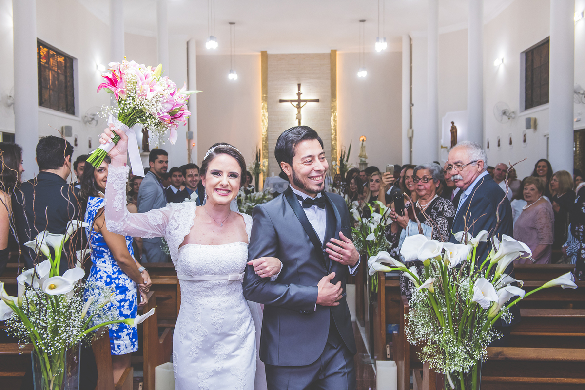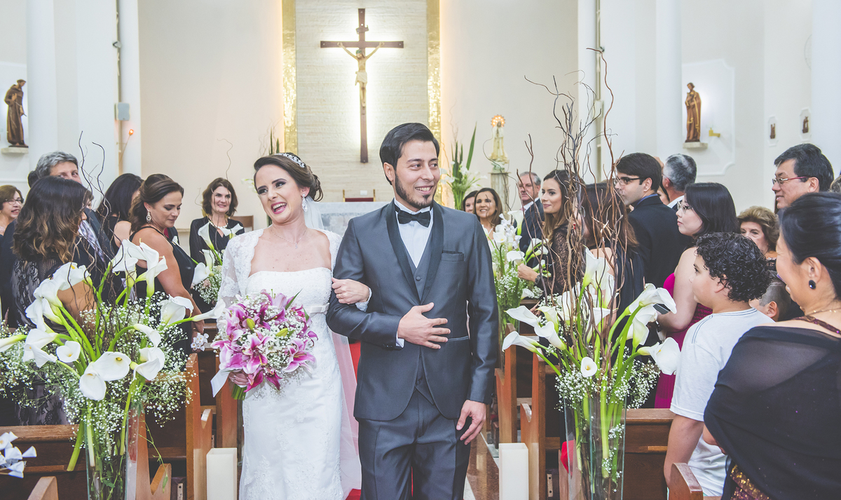 Noivos saindo da igreja e recebendo com sorriso os convidados