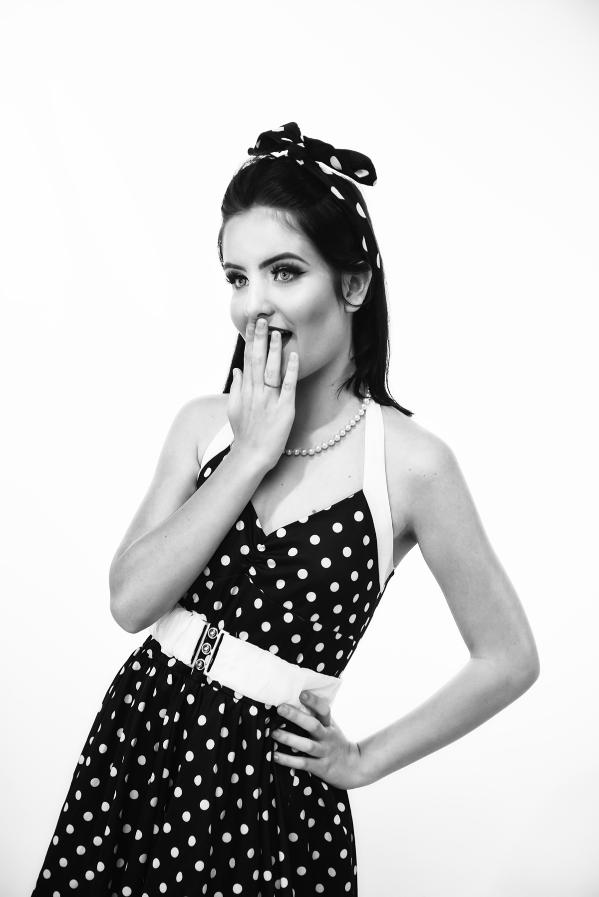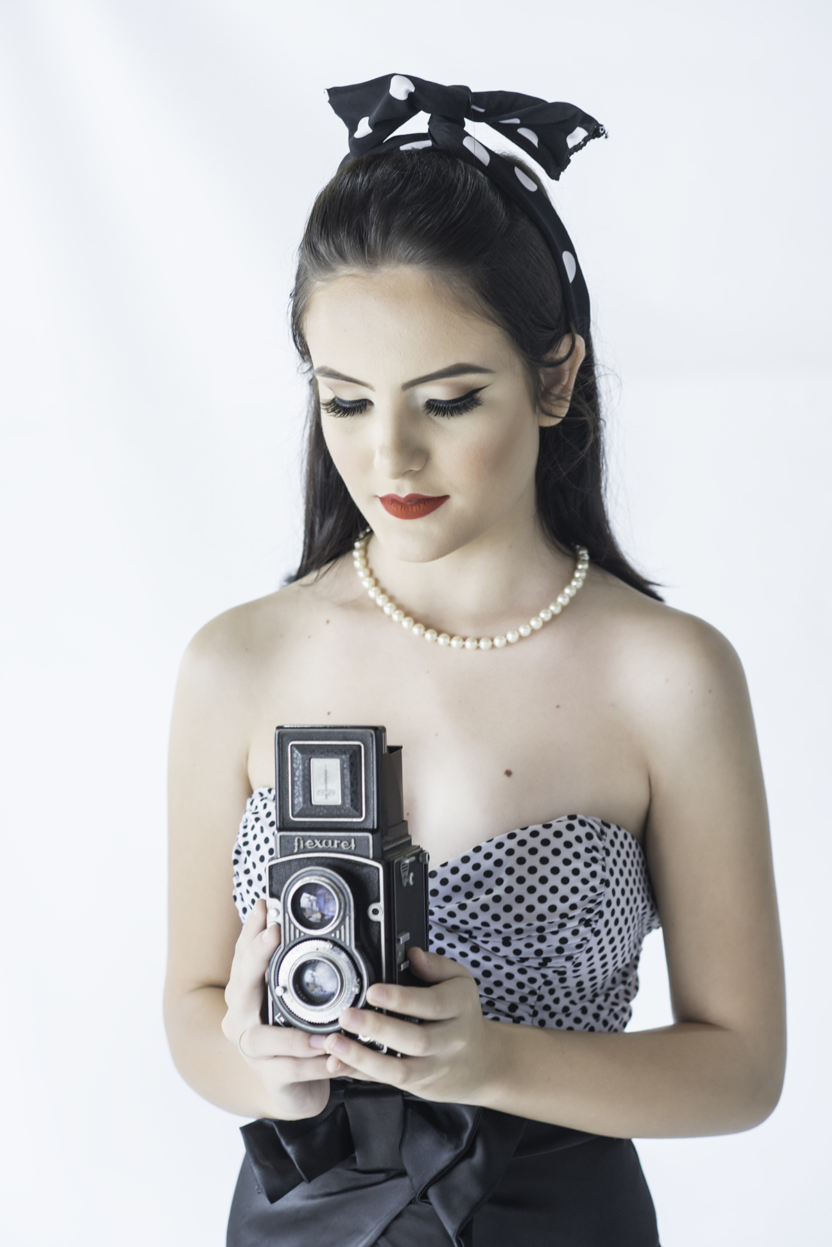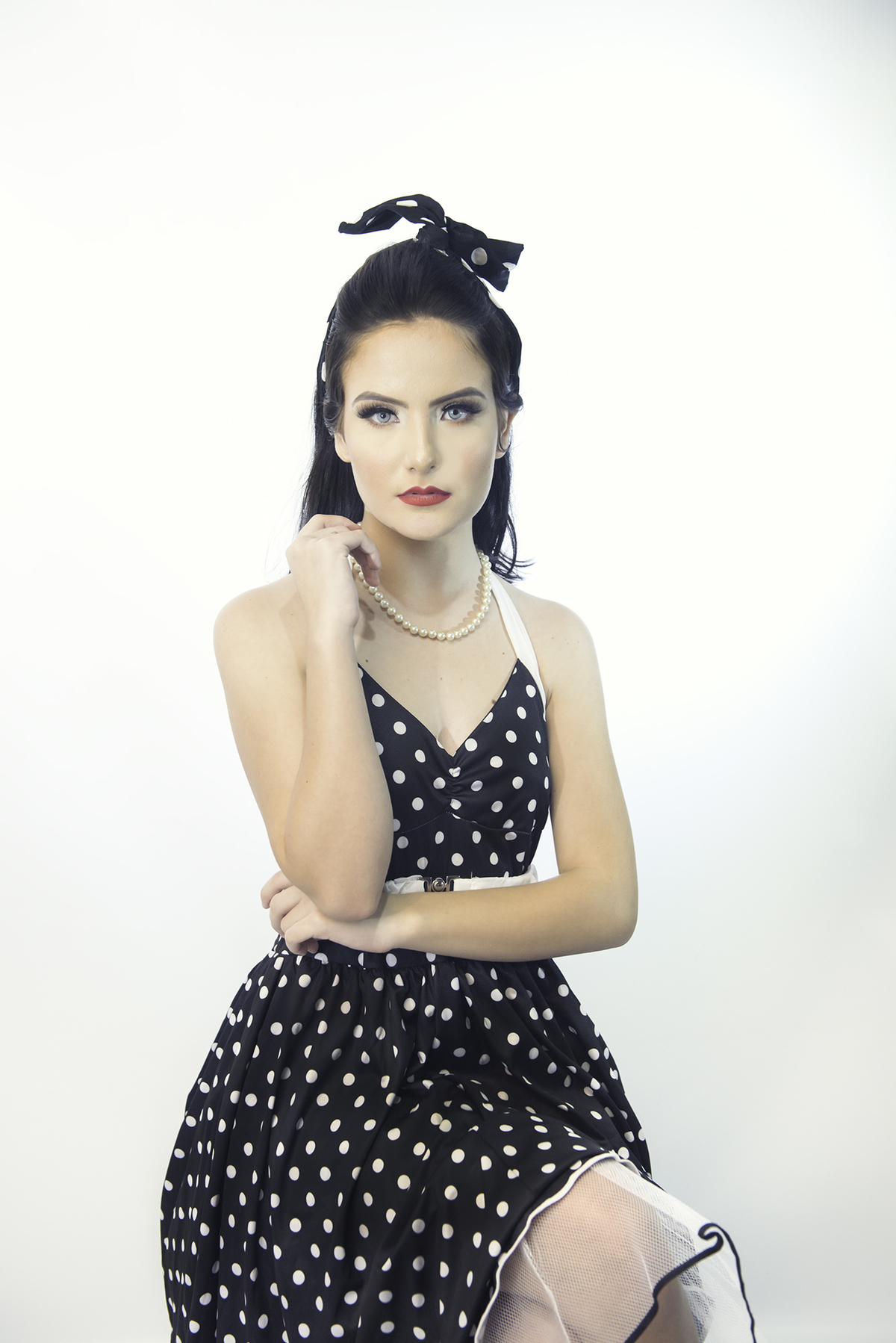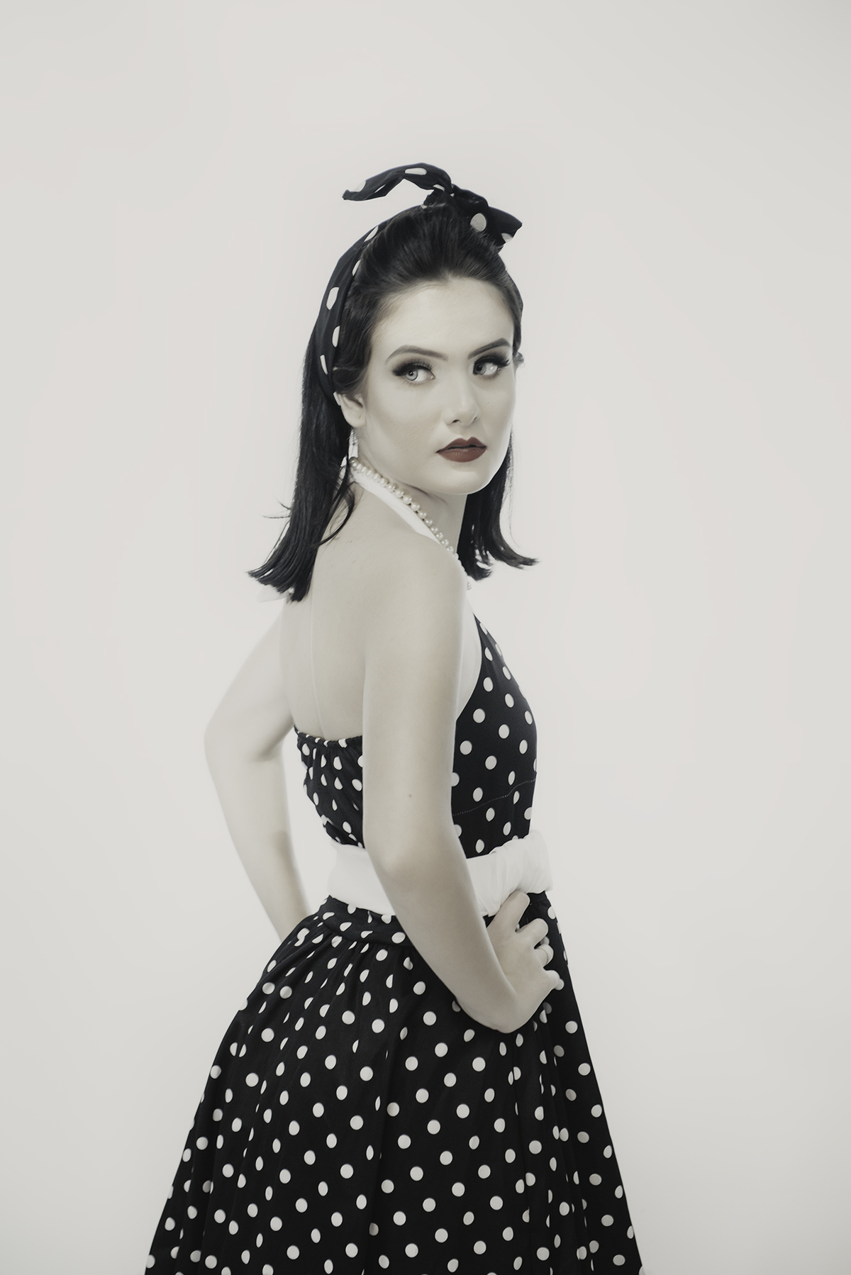 De modo geral, peças inspiradas nos anos 1950 são perfeitas para ensaios desse tipo: saias estampadas em poá — as famosas bolinhas — e vestidos godê, macaquitos, camisas de botões e shorts de cintura alta. E não esqueça as cintas-ligas, as meias 3/8, os lenços, os penteados armados e a maquiagem característica.