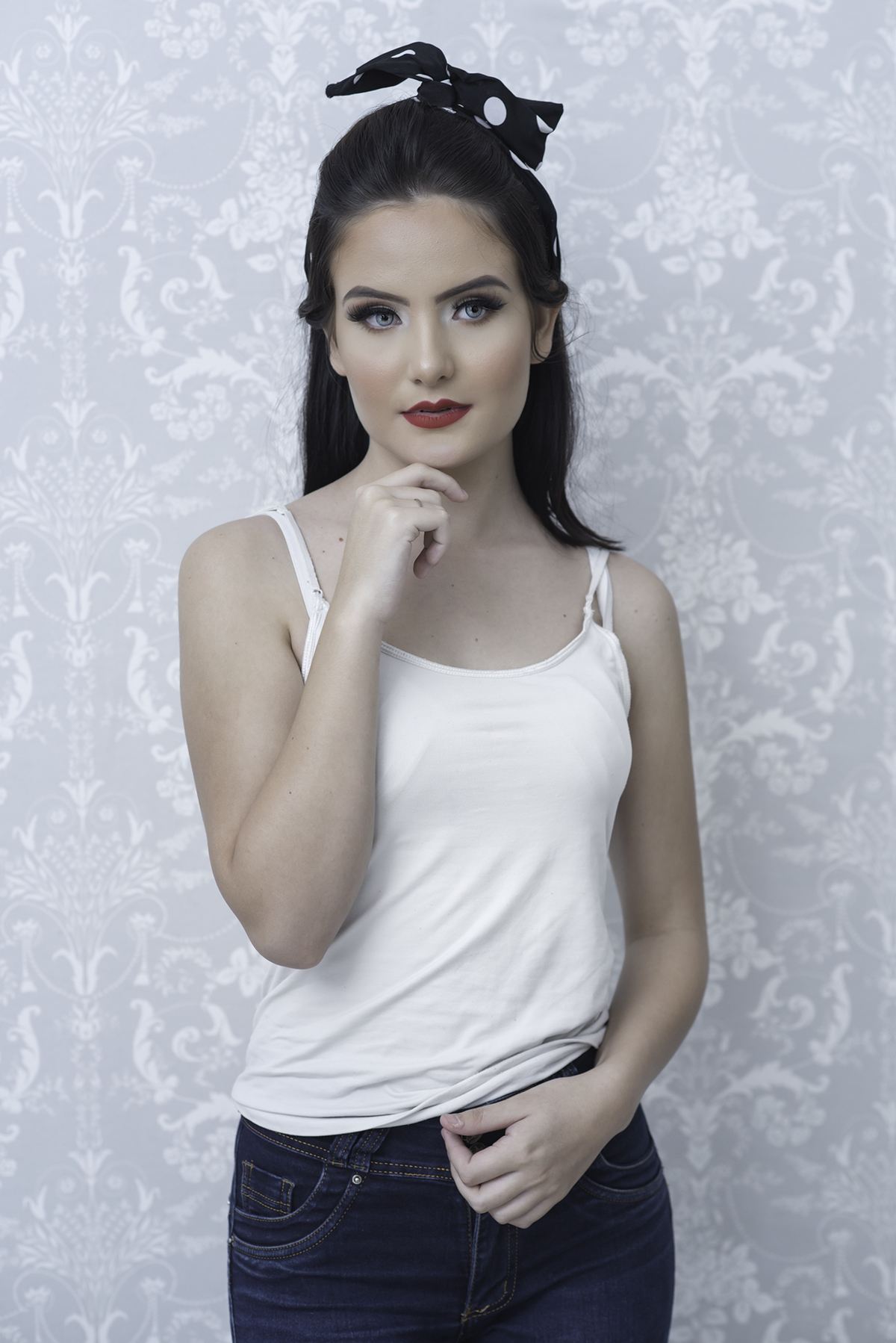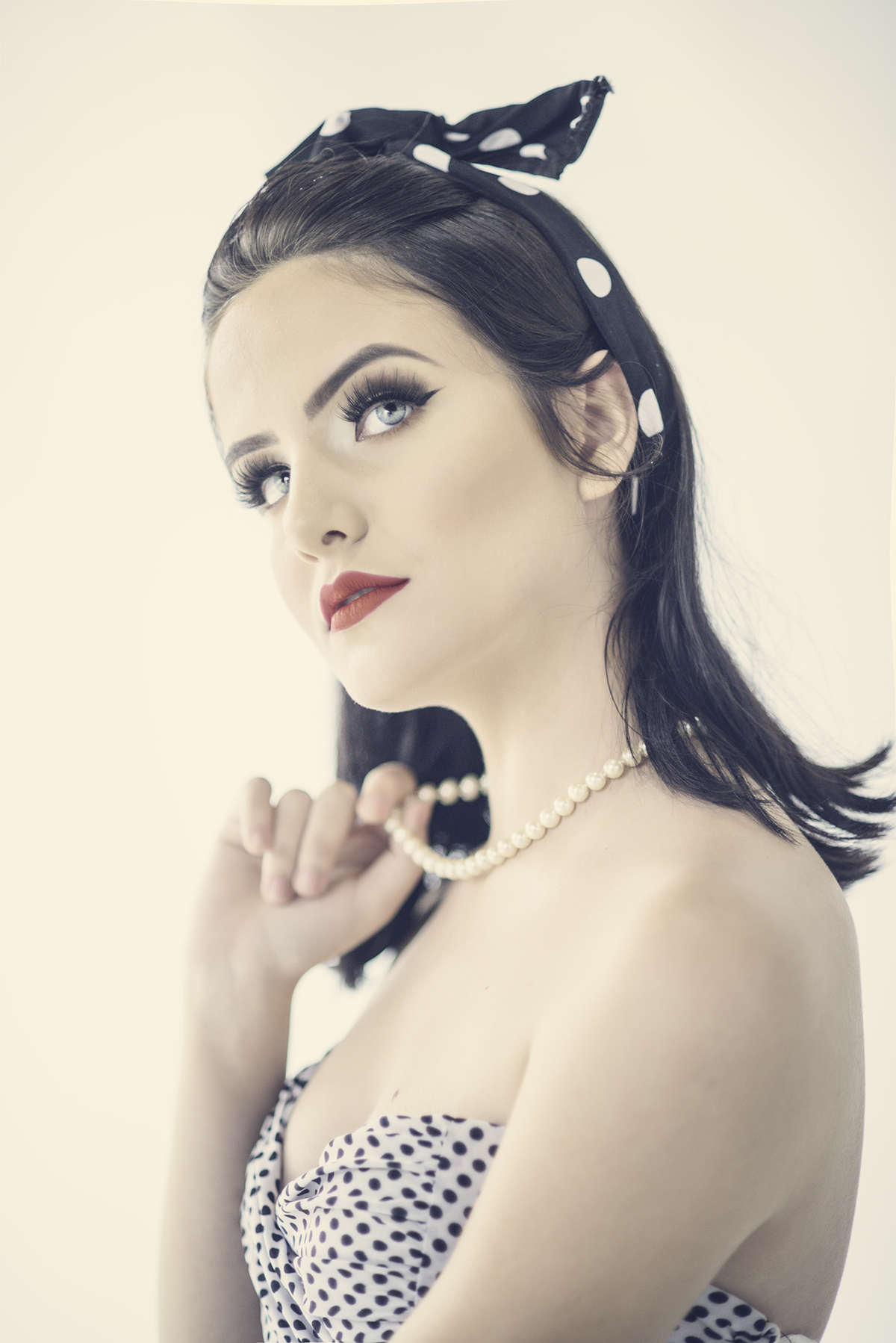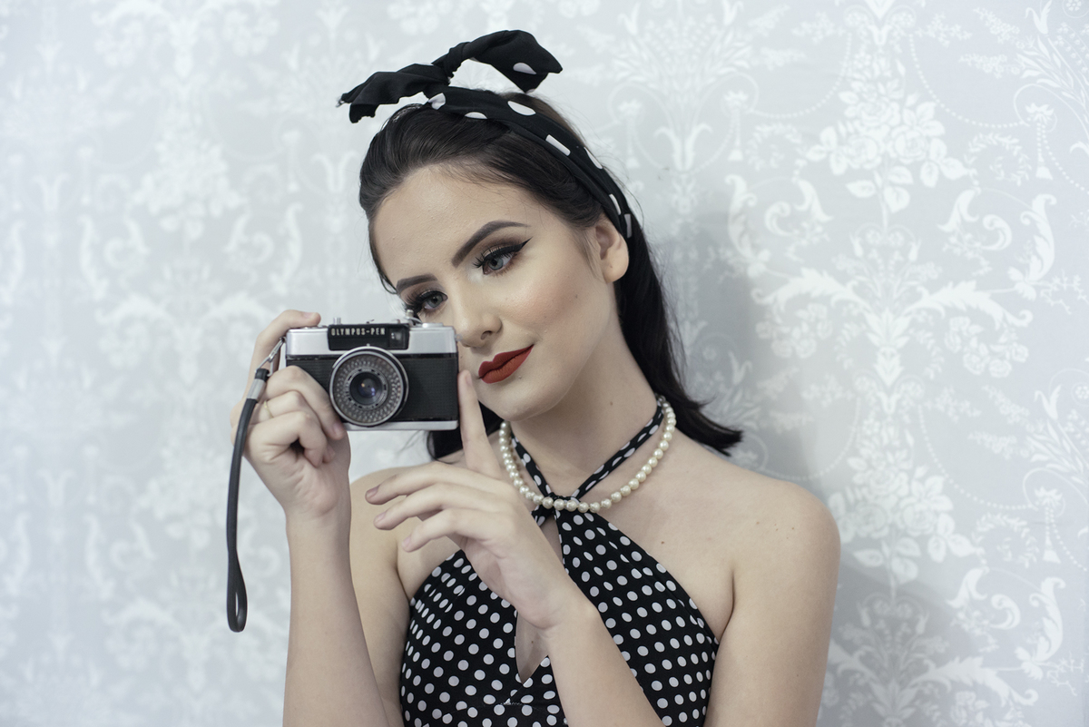 Maquiagem, ela é um grande marco em um ensaio pin-up. A pele deve estar impecável, os olhos, bem delineados, e a boca pede um tom marcante.